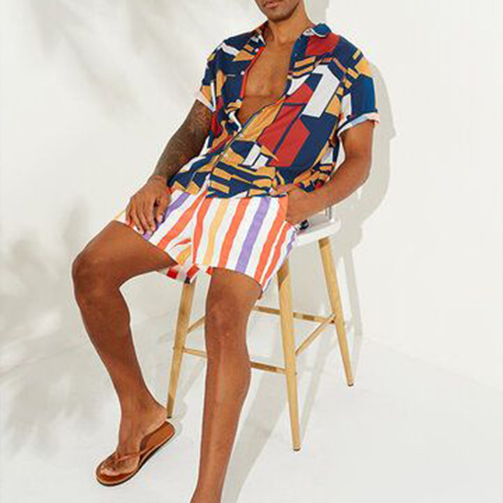 New contrast color geometric pattern printed shirt casual fashion short-sleeved shirt men
